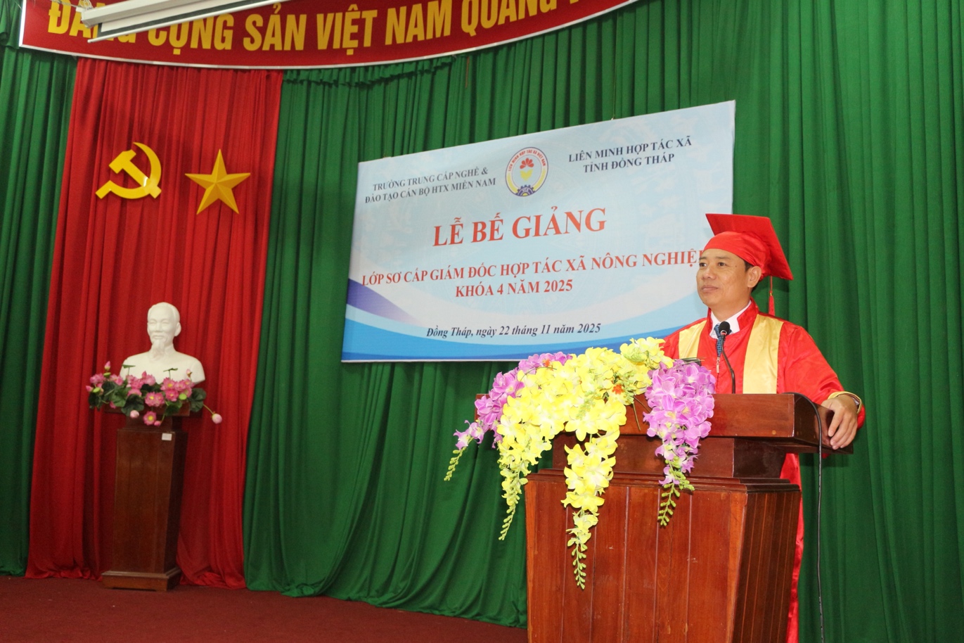 Tại buổi lễ, ông Lê Quang Cường – Chủ tịch Liên minh Hợp tác xã tỉnh Đồng Tháp – đánh giá cao sự phối hợp chặt chẽ giữa Trường Trung cấp nghề và Đào tạo cán bộ HTX miền Nam với Liên minh HTX tỉnh trong công tác đào tạo, xem đây là bước đi thiết thực góp phần nâng cao chất lượng nguồn nhân lực cho khu vực kinh tế tập thể. Ông nhấn mạnh khóa học là nền tảng quan trọng để hình thành đội ngũ cán bộ quản lý HTX có trình độ, đáp ứng tốt yêu cầu đổi mới và phát triển trong giai đoạn hiện nay. Đồng thời, ông kỳ vọng mỗi học viên sẽ tiếp tục rèn luyện năng lực, phát huy tinh thần gắn kết và vận dụng hiệu quả những kiến thức đã được trang bị nhằm giải quyết các thách thức đặt ra trong thực tiễn hoạt động của HTX, nhất là trong bối cảnh cạnh tranh và hội nhập ngày càng sâu rộng.