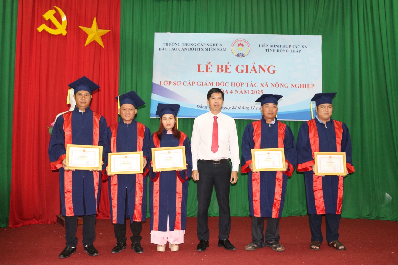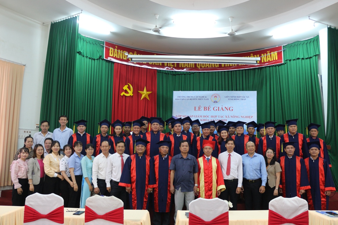 Ngày 22/11/2025, Trường Trung cấp nghề và Đào tạo cán bộ Hợp tác xã miền Nam phối hợp với Liên minh Hợp tác xã tỉnh Đồng Tháp tổ chức Lễ bế giảng Lớp sơ cấp Giám đốc Hợp tác xã nông nghiệp Khóa 4 năm 2025, với 30 học viên hoàn thành chương trình và được cấp chứng chỉ.